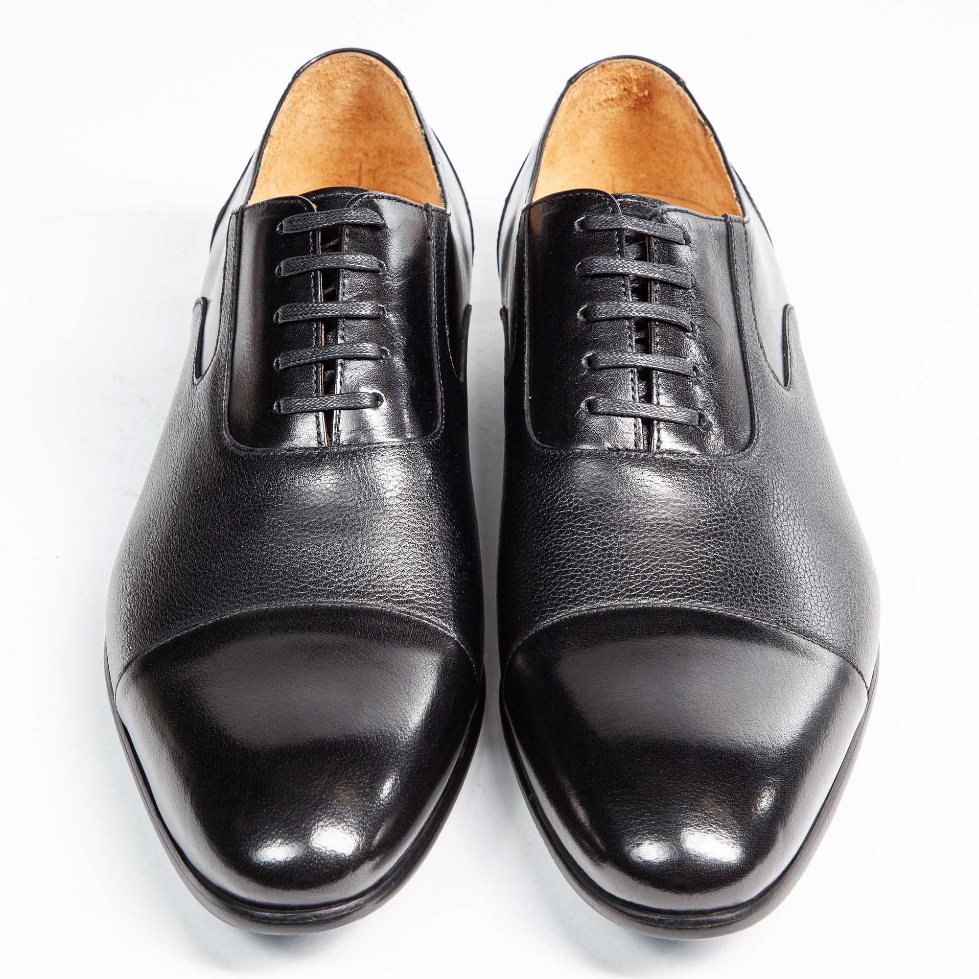 This Signature Black Semi-Formal Dress Shoe by Franco Uomo is made of the highest level Italian leather and craftsmanship. The Oxford Cap Toe is a versatile shoe that can be worn for dressy occasions or for business making it a perfect staple for your closet. The David Black Dress Shoe pairs wonderfully with a mixture of formal black and grey suit fabrics or denim. We highly recommend this shoe for Business and Formal Occasions.